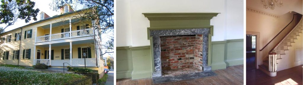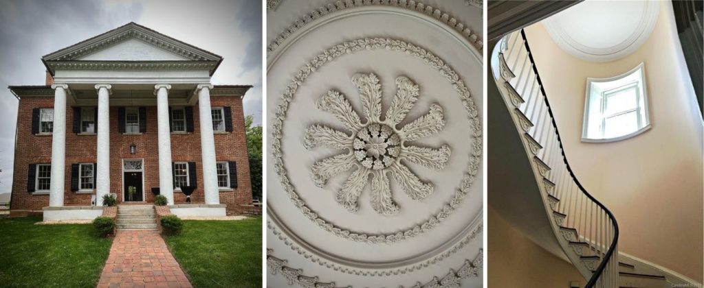 The Flemish-bond brick house is notable for having benefitted from a well-informed designer who not only composed one of the earliest examples of the monumental portico in NC – in this case, Ionic – but also was familiar with Owen Biddle’s Young Carpenter’s Assistant publication of 1805. The current owner has convincing documentation that Ingleside’s designer was architect Ithiel Town. Facade details include jack arches over windows and entryways, and an intricate demilune fanlight of leaded glass is centered above the front door. The cornice is of particular note for featuring elegant, scrolled modillions above dentils. Ingleside’s interior features represent a high-water mark for the Federal Period in North Carolina, centered on the elliptical curving stair with Owen Biddle-inspired scrolls ornamenting the open string of the stair. In the Drawing Room, engaged and fluted colonettes and rope molding embellish the Federal style mantel. Its three-part frieze with elliptical sunbursts with a dentil cornice is attributed to Jacob Stirewalt, a German craftsman who was responsible for pattern book designs seen in the houses in neighboring counties.