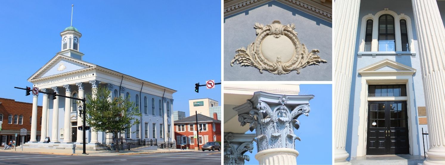 The Old Davidson County Courthouse was built by William Ashley and George Dudley between 1856 and 1858 on the courthouse square in Lexington. It was designed in the temple form with an impressive portico of Corinthian columns and entablature. It’s stuccoed facade was originally scored to resemble stone. Above the portico, an octagonal clock tower features louvered round-headed arches. Round-arched windows in the Italianate style hint at the next popular architectural style in our state.