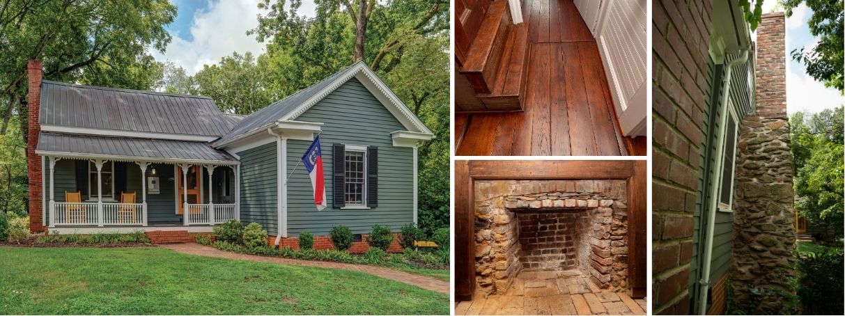 The Lewis Freeman House in Pittsboro, Chatham County, was built by a free Black man, Lewis Freeman, between 1811 and 1837. This modest dwelling began as a one-room structure, a typical house form across our state in the nineteenth century. The timber frame cottage was a step up from a log house and was heated by one exterior end chimney. The house contained a small second-story loft reached by a ladder or boxed-in staircase. An early one-room addition with a slightly lower roofline was added to the west side of the house. It features a notable chimney that has a stone and clay base that supports a narrow brick “neck.” Another addition was added in the 1890s that included a front porch with turned posts, and a sawn pendant border and foliated brackets.