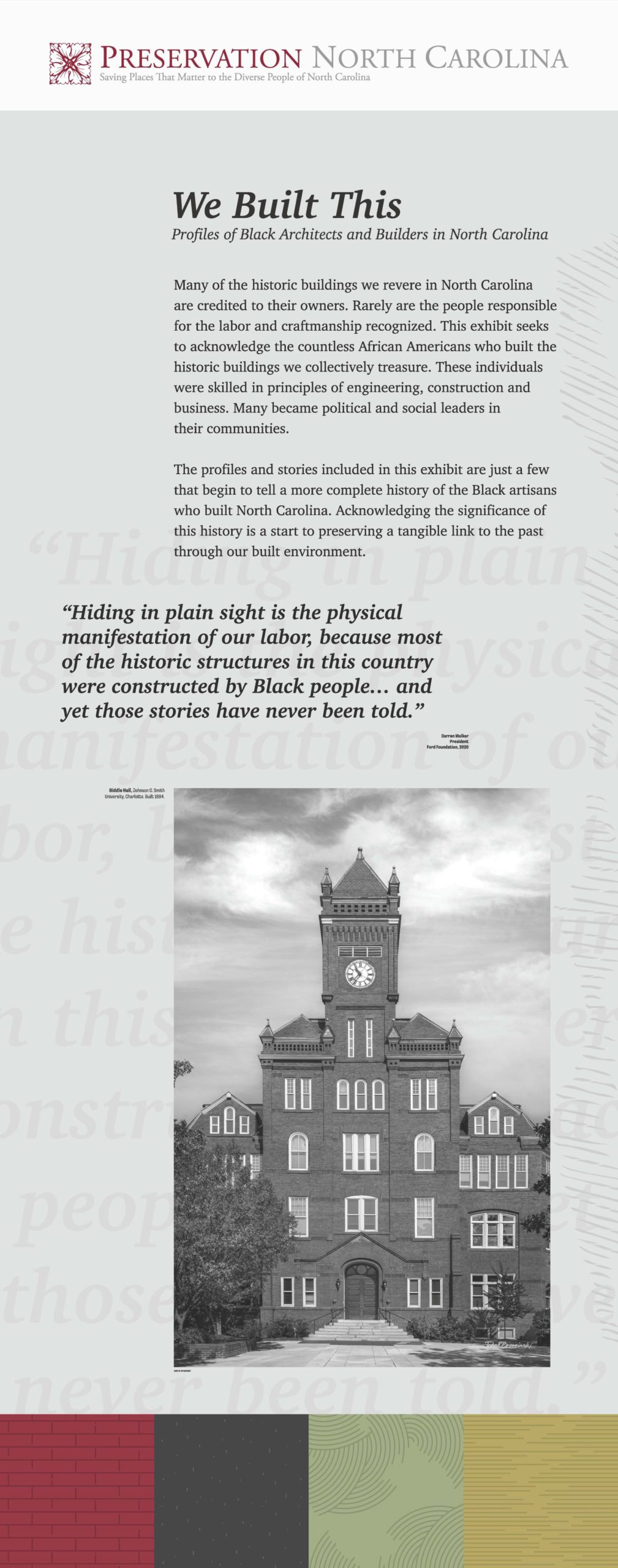 Preservation North Carolina’s We Built This program is composed of three parts. A detailed and illustrated traveling exhibit, “We Built This: Profiles of Black Architects and Builders in North Carolina” is currently on display at North Carolina Central University in Durham. A televised documentary is in the final stages of completion; and a third component of the program is a book that will be published with UNC Press next year. Click to learn more about how to bring the We Built This exhibit to your community!