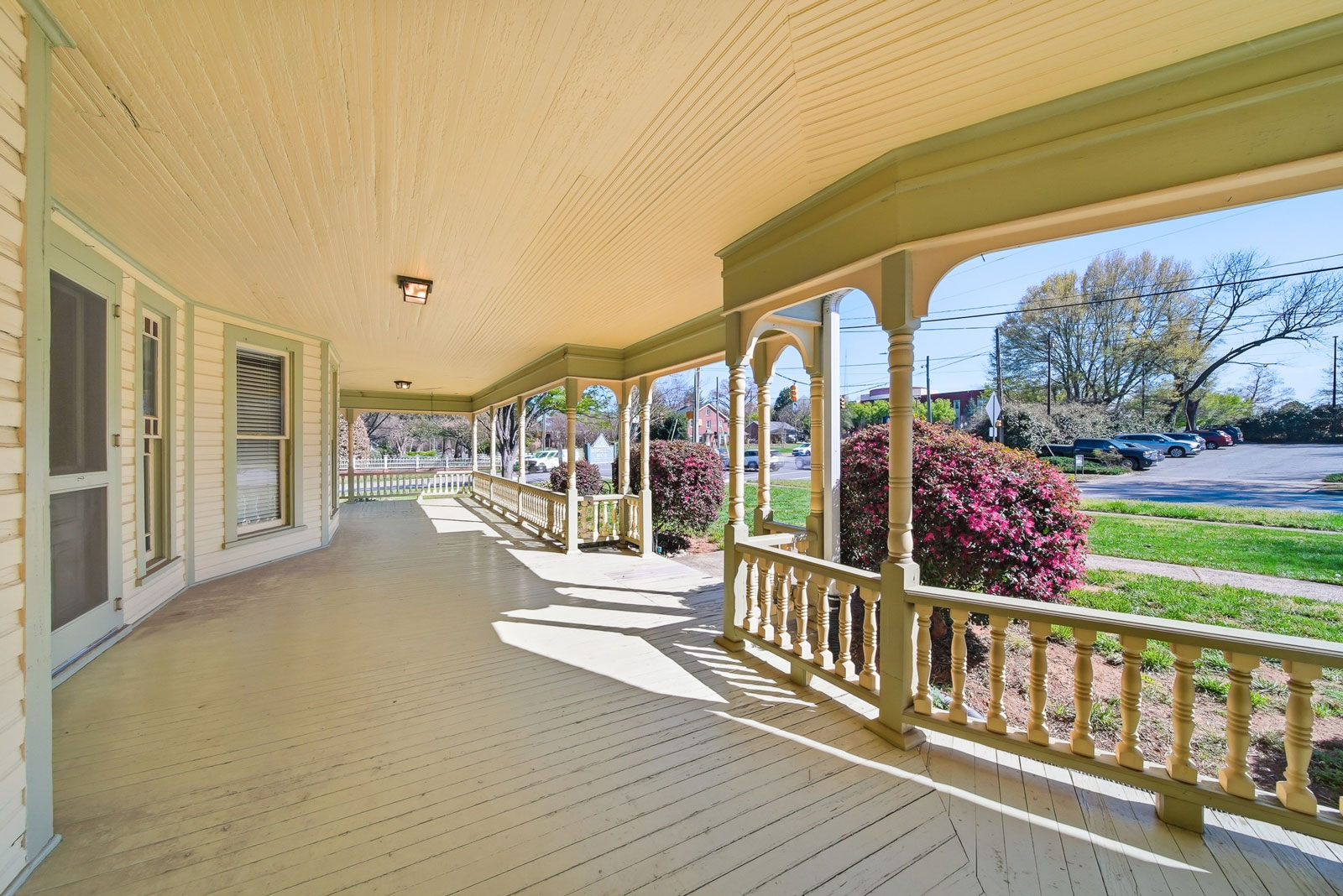 The main level offers a large central foyer opening to two front parlors, a dining room with original built-in china cabinet and wainscot, main-level bedroom with en-suite bonus room, kitchen, laundry, and mud room. Winding your way upstairs via the beautifully detailed staircase made of heart pine, another large landing awaits with a stained glass exit to the centrally located upper level porch. Upstairs, four generously sized bedrooms all offer fireplaces and share a hall bathroom.
